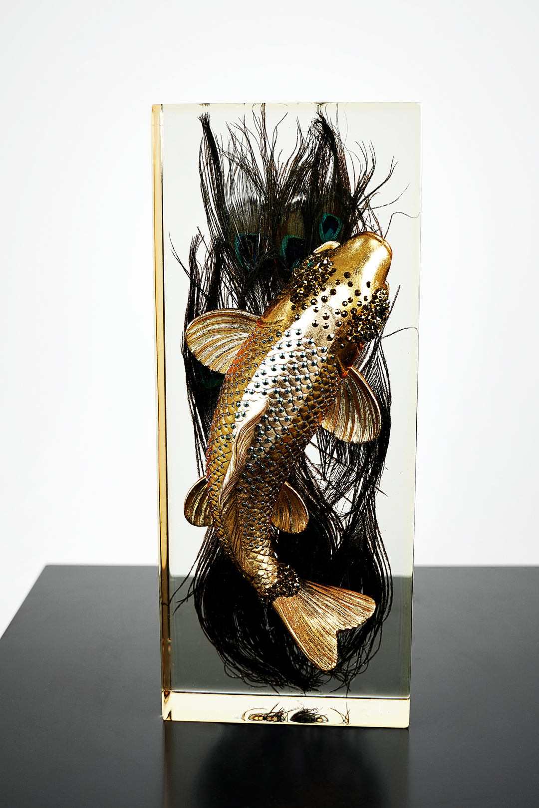 Behold the majestic beauty captured in the singular creation of a gilded Koi carp adorned with shimmering crystals, encased in a lustrous sheath of epoxy. This unparalleled masterpiece stands as the epitome of artistic finesse, meticulously handcrafted to embody sheer exclusivity.