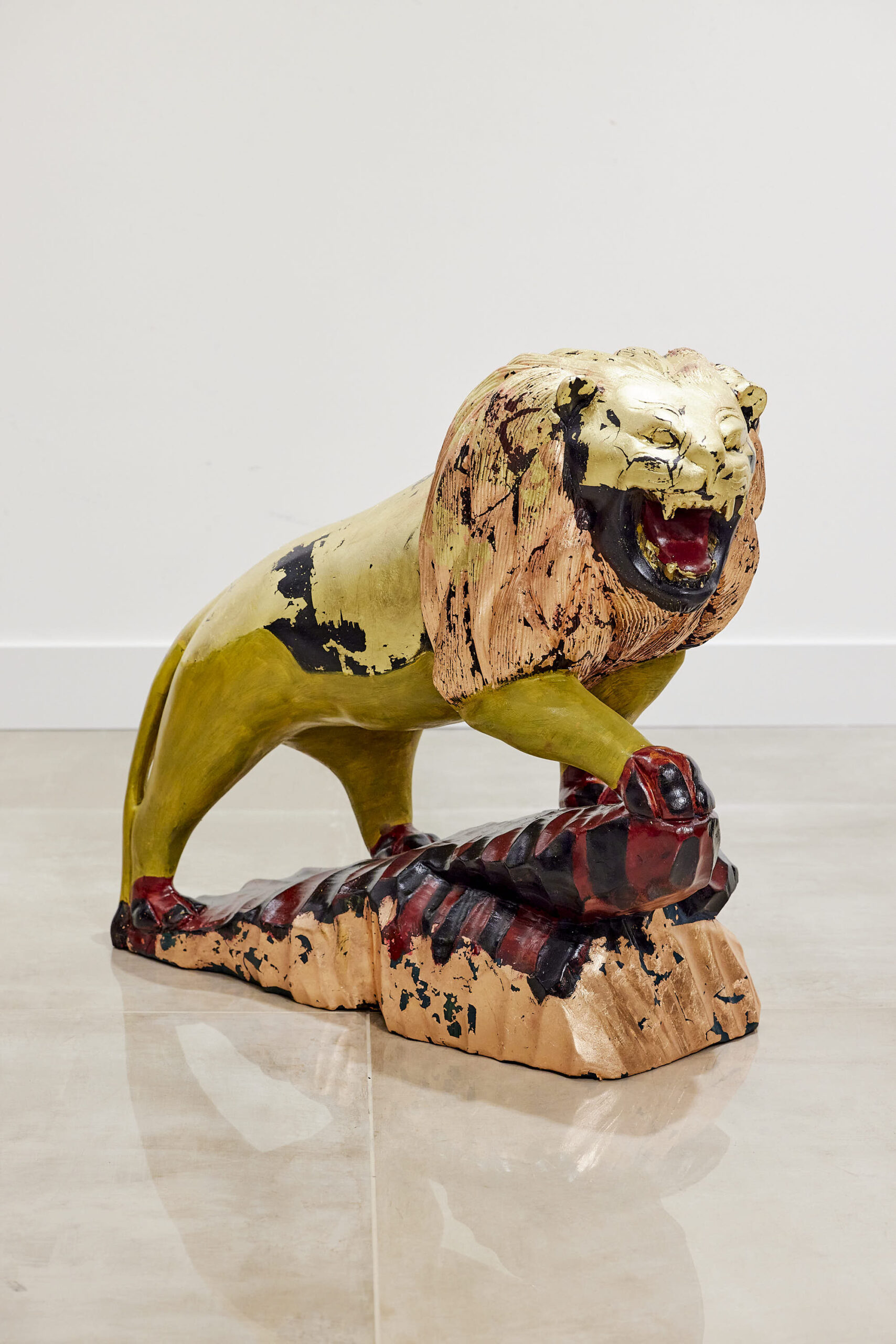 But it is not only the exquisite craftsmanship that sets this piece apart; it’s the opulent touch of gold leaf that elevates its splendor to unparalleled heights. Delicately applied by hand, the golden accents dance along the lion’s contours, casting a radiant glow that catches every glimmer of light, breathing a sense of celestial majesty into the sculpture.