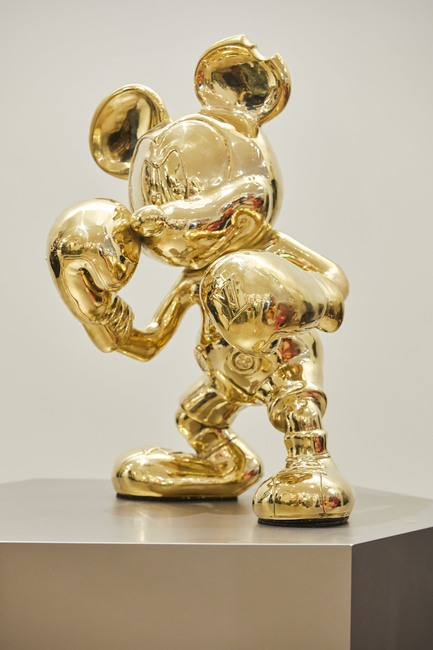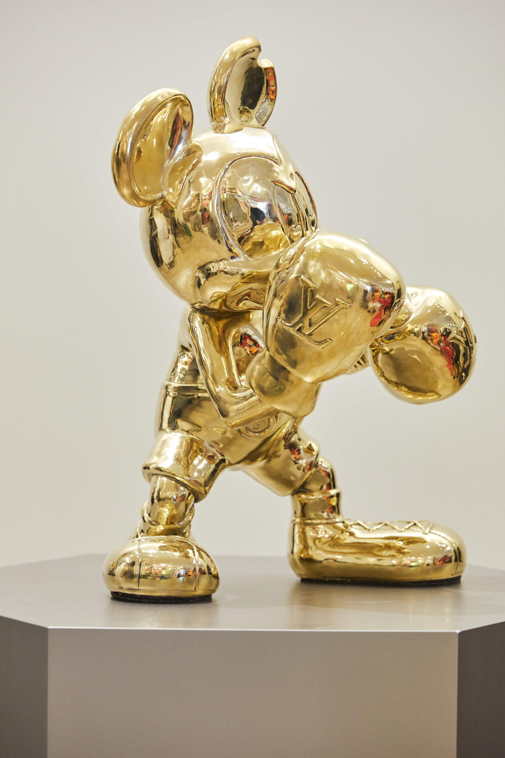 In the image, we see Mickey Mouse wearing boxing gloves and in an attacking position, with the famous fashion brand visible on his body. This may suggest a connection between the iconic character and the world of luxury fashion.