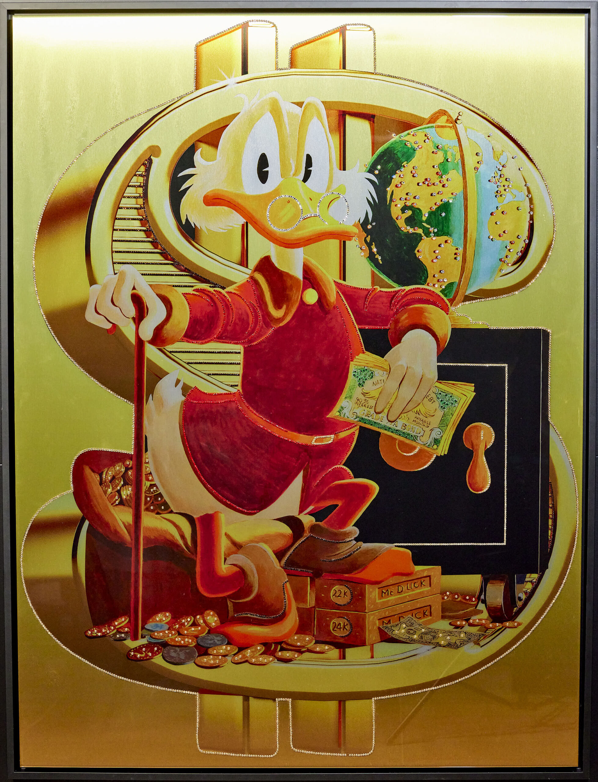 Encased within a sleek black wooden frame, the “Moneymaker Masterpiece” exudes an air of exclusivity and grandeur. Each Swarovski crystal meticulously placed, casting shimmering reflections that dance across the room, captivating all who behold it. It is a testament to the convergence of artistry and opulence, a symbol of the elite’s unrelenting pursuit of affluence.