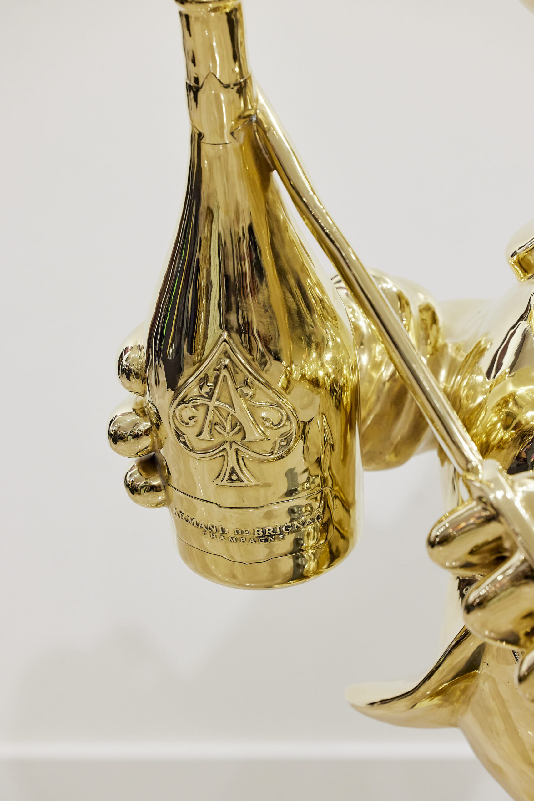 The artwork “Mr. Moneypopper 100 cm” was created by artist Jorn van Hoorn. The technique used in the artwork is Brons beeld / echte diamantje / hand gepolijst, which means it was created using bronze, decorated with small real diamonds, and polished by hand.