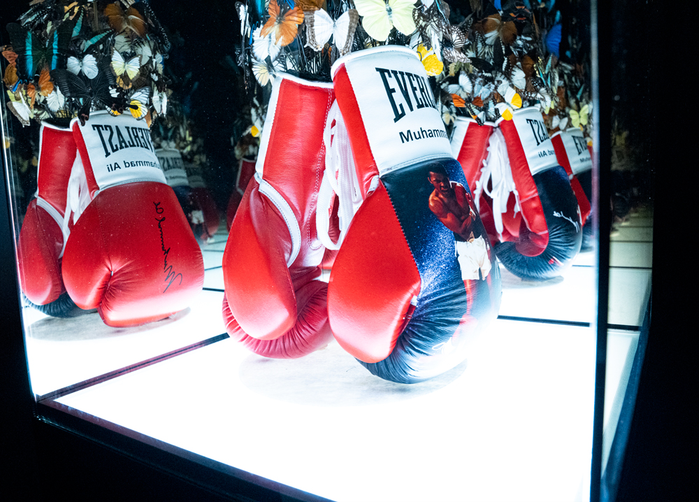 The artistic brilliance of “Muhammad Ali Butterfly” lies in its ability to blend strength and fragility, power and grace, within a single composition. The boxing gloves, once instruments of aggression, now cradle the delicate beauty of butterflies, suggesting a harmonious confluence of opposing forces. This delicate balance is further emphasized by the museum glass box, which serves as a protective enclosure while simultaneously allowing the artwork to breathe and interact with its surroundings.