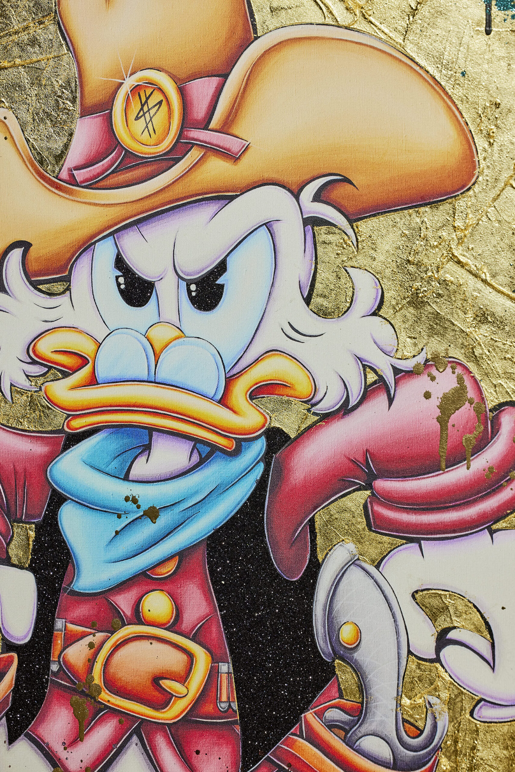 Introducing “Risktaker,” a captivating artwork that blends pop culture with Wild West flair. Featuring the iconic Scrooge McDuck, reimagined as a seasoned cowboy, this piece embodies the spirit of adventure and daring.