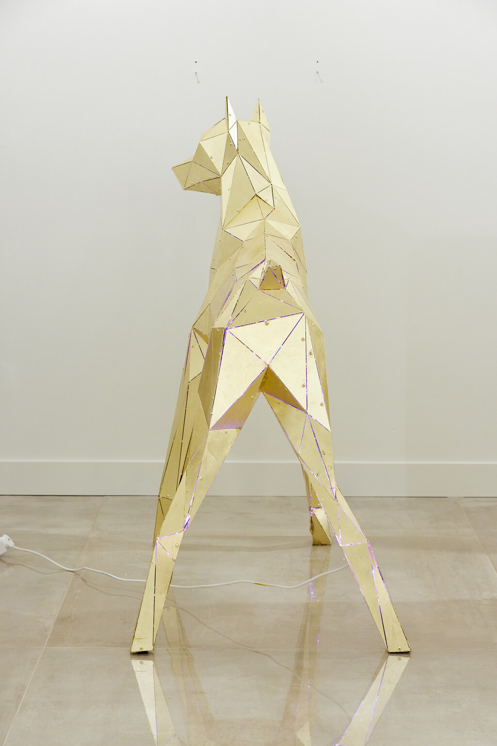 “The ‘Abstract Doberman’ stands as a testament to the fusion of contemporary art and timeless elegance. This unique masterpiece, adorned with the intricate embellishment of lustrous gold leaf, captures the essence of luxury and sophistication. Every brushstroke and every contour reflects the artist’s meticulous dedication to crafting a piece that transcends the boundaries of conventional perception.
