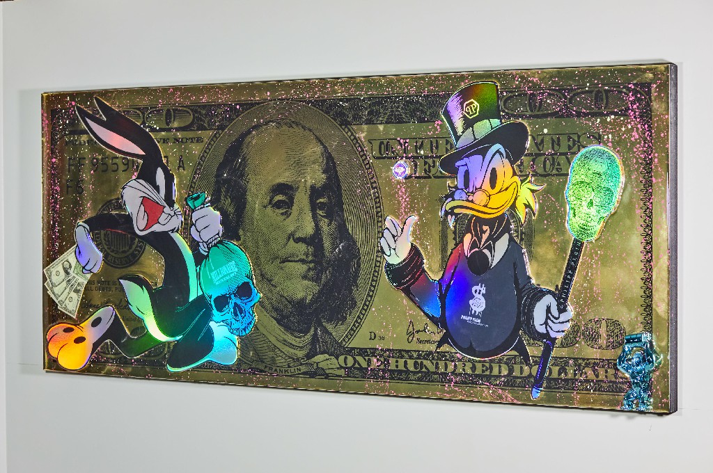 The artwork “Money talks bullshit walks” created by artist Diederik van Apple depicts a dollar bill with the images of Bugs Bunny and Scrooge McDuck. The technique used is aluminum, hologram and high-gloss resin, which adds an element of depth and shine to the piece.