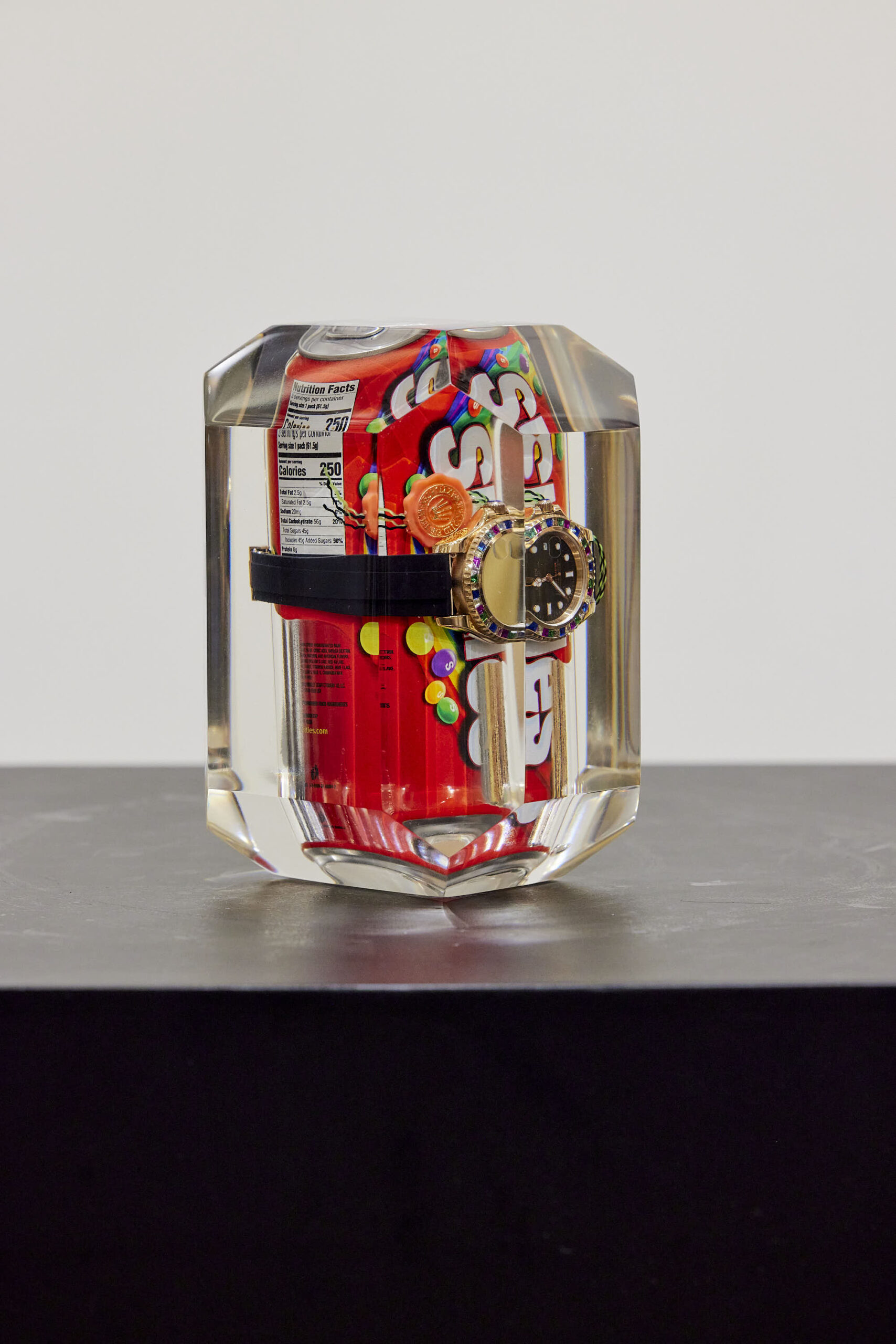 At first glance, “We love Skittles” appears as a mere block of epoxy resin, unassuming and enigmatic. However, upon closer inspection, its true essence begins to unfold. Encased within the transparent resin lies a humble skittles bag, its familiar logo serving as a poignant symbol of mass consumption and corporate influence. Yet, juxtaposed against this emblem of commercialism is an unexpected element—a ‘Oyster Rolex’ watch.