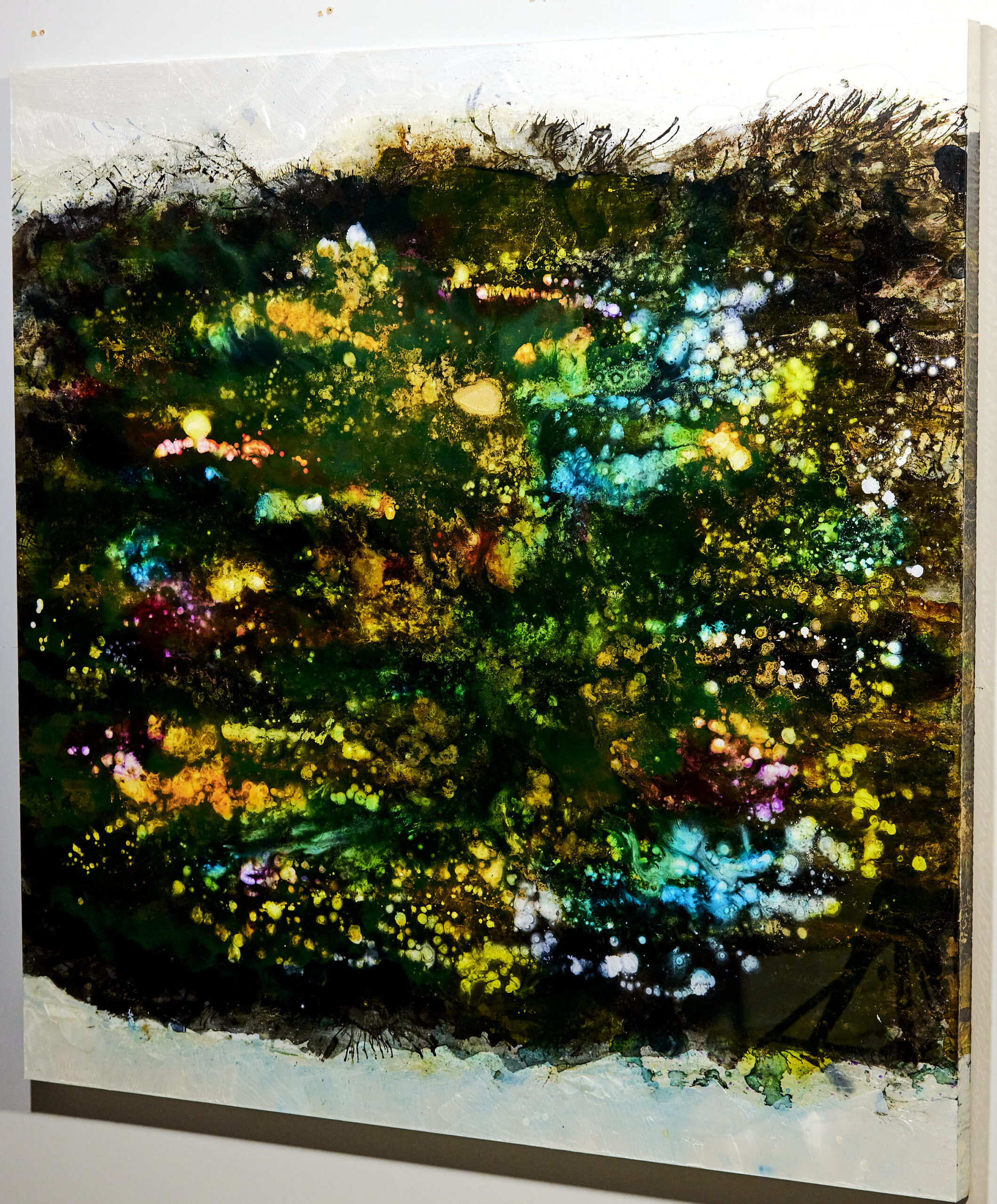 In summary, James Chiew’s artwork entitled “Lost in Wonderland” is an abstract piece that presents a composition of vibrant shapes and colors on a black background, creating a sensation of depth and mystery. With its impressive dimensions of 150x150cm, the piece is an impactful and expressive work of art.